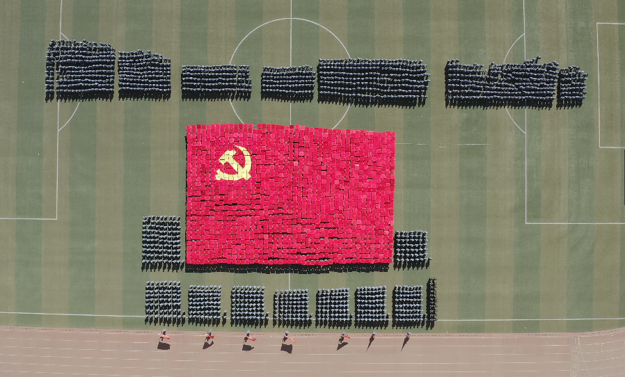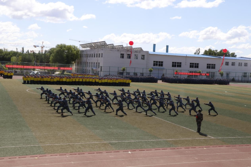 分列式后,進行了軍事技能匯報表演,含擒敵拳、刺殺操、方陣表演等節目。擒敵拳方隊剛勁有力、動作鏗鏘,體現了鋼鐵一般的意志;刺殺操方隊動作整齊、威風凜凜,彰顯了威武不屈的氣勢;方陣表演的1350名學生手持紅黃兩色的圖板,高喊著“艱苦樸實、勤奮進取”的口號跑進會場,在會場中心組成“70”和“砥礪奮進七十年,同心共筑建大夢”的字樣,在教官的指揮下,方陣迅速變化,呈現黨旗圖案,在黨旗圖的下方和上方先后呈現1921-2021和100字樣,最后又定格成黨旗圖案,全體軍訓學生合唱《團結就是力量》,獻禮建黨100周年和建校70周年。