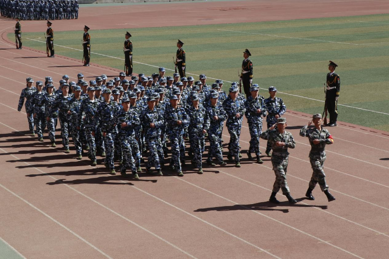 在莊嚴的升旗儀式后,7個受閱方隊以飽滿的精神狀態接受檢閱,受閱方隊在教官的指揮下依次通過主席臺。他們斗志昂揚、步伐整齊、口號響亮,彰顯了錚錚鐵骨的軍人風采和激昂向上的精神面貌。