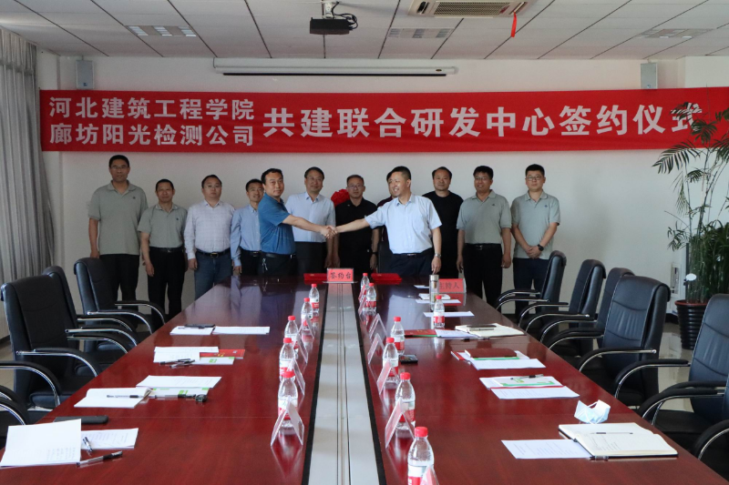 5月29日下午,學校與在陽光建設工程質量檢測有限公司會議室簽署共建聯合研發中心長期合作協議。校黨委書記王海龍教授、廊坊市陽光建設工程質量檢測有限公司總經理魏志文、廊坊市科技局局長李國彬、建設局副局長張志文以及學校土木工程學院施工教研室主任李志強教授、結構實驗室主任郝勇副教授、重點實驗室主任徐永峰副教授出席了簽約儀式。