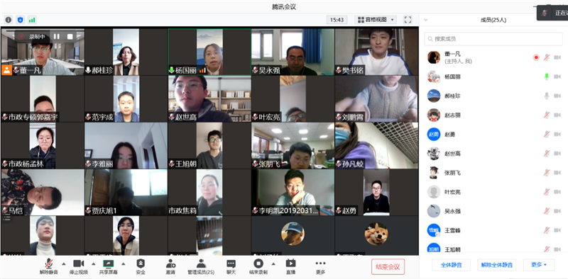 近日,學(xué)校組織各培養(yǎng)院系召開(kāi)了研究生培養(yǎng)和教學(xué)工作線上座談會(huì),就線上教學(xué)、研究工作進(jìn)行交流研討,同時(shí)對(duì)期初培養(yǎng)和教學(xué)效果進(jìn)行檢查。各培養(yǎng)院系主管領(lǐng)導(dǎo)、導(dǎo)師代表、任課教師代表、研究生秘書(shū)、輔導(dǎo)員和研究生代表參會(huì)。通過(guò)座談會(huì)了解到,廣大師生表示在收看過(guò)校黨委書(shū)記王海龍教授的開(kāi)學(xué)第一課后,重溫了過(guò)去一年國(guó)家發(fā)展成就和抗擊疫情偉大勝利。廣大師生代表表示,要積極克服疫情不利影響,繼續(xù)認(rèn)真上好每一堂課、認(rèn)真寫(xiě)好每一篇論文、認(rèn)真做好每一項(xiàng)課題研究。