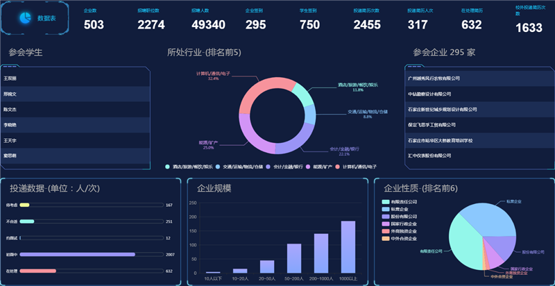 通過嚴(yán)格審核的參會(huì)企業(yè)共有503家,雙選會(huì)當(dāng)天參會(huì)企業(yè)共295家,包括中建八局第二建設(shè)有限公司、中建鐵路投資建設(shè)集團(tuán)有限公司、中國建筑第六工程局有限公司天津軌道交通分公司、中國電建集團(tuán)河北工程有限公司、中國輕工建設(shè)工程有限公司、中國核工業(yè)第二二建設(shè)有限公司、中國二十二冶集團(tuán)有限公司、中建路橋集團(tuán)有限公司、中國水利水電第十二工程局有限公司、中國建筑土木建設(shè)有限公司、中國石油工程建設(shè)有限公司華北分公司、中鐵二十一局集團(tuán)第三工程有限公司、中鐵大橋局上海工程有限公司等知名企業(yè)參會(huì)選聘我校畢業(yè)生,共發(fā)布職位數(shù)2274個(gè),招聘人數(shù)達(dá)49340人,在線投遞簡歷2455份,平臺(tái)線上面試2007次。參會(huì)用人單位規(guī)模1000人以上的約有180家,國有企業(yè)有37家,參會(huì)單位在所處行業(yè)排名前五的共有68家。