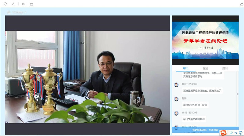 按照國家教育部、省教育廳新冠肺炎疫情期間“延期不延教、停課不停學”要求,結合當前學院疫情防控實際情況,經管學院共克時艱、迎難而上,借助建筑云課直播軟件,創新研學形式,開辟青年學者論壇新陣地。