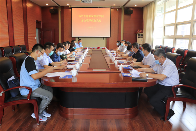 6月22日,廊坊師范學院黨委書記韓同銀,校黨委副書記、校長楊學新,副校長陳忠杰、孫政及辦公室、科研處、國資與后勤處負責人等一行10人來我校考察交流。