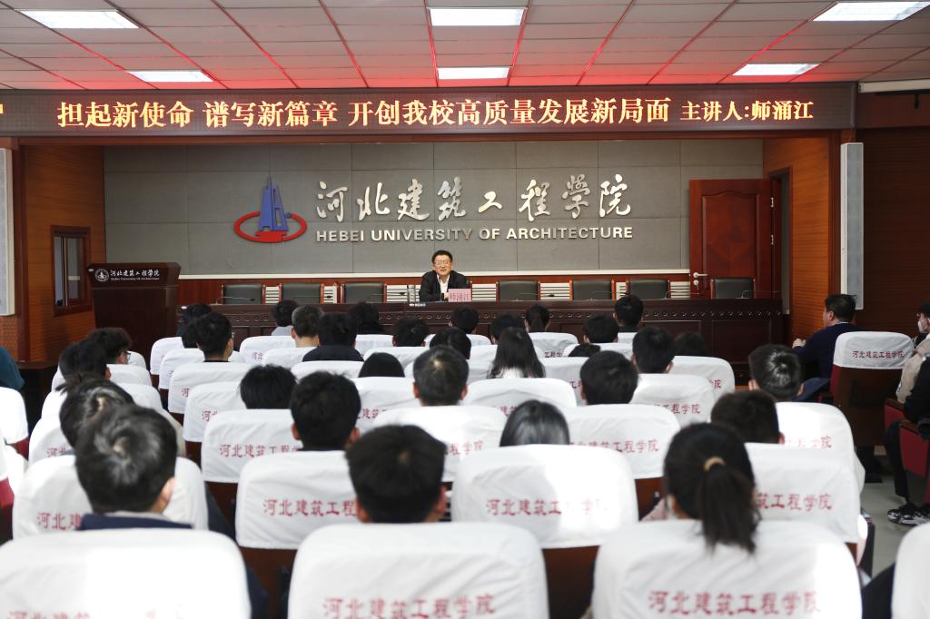 師涌江針對黨的二十大報告中開辟馬克思主義中國化時代化新境界、新時代新征程中國共產黨的使命任務、加快構建新發展格局著力推動高質量發展等三部分內容進行了重點解讀。他理論聯系實際,結合國情、省情、校情,闡釋了“中國式現代化”及其背景下的“河北場景”和“建院畫卷”的概念、特征、目標及實施路徑。同時勉勵廣大青年學子要把自己的理想同祖國的前途、民族的命運緊密聯系在一起,勤學苦練、增長才干、珍惜韶華、不負青春,早日成長為一名有理想、有本領、有擔當的高素質技術技能人才,讓青春年華在為國家、為人民的奉獻中煥發出絢麗光彩。