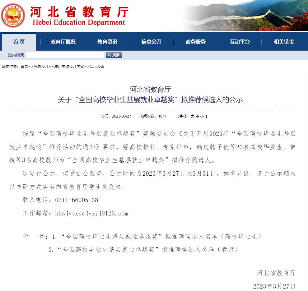 近日,河北省教育廳發布《關于“全國高校畢業生基層就業卓越獎”擬推薦候選人的公示》的通知,經高校推薦、專家評審,確定我校經濟管理學院2016屆工程管理專業畢業生李杜榮為“全國高校畢業生基層就業卓越獎”河北省推薦候選人,全省僅推薦20人。