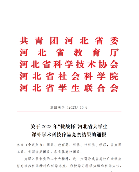 近日,共青團河北省委、省教育廳、省科協、省社會科學院、省學聯下發了《關于2023年“挑戰杯”河北省大學生課外學術科技作品競賽結果的通報》,我校榮獲優秀組織獎, 22項作品獲省級獎項,其中,特等獎1項、一等獎4項、二等獎7項,三等獎10項。