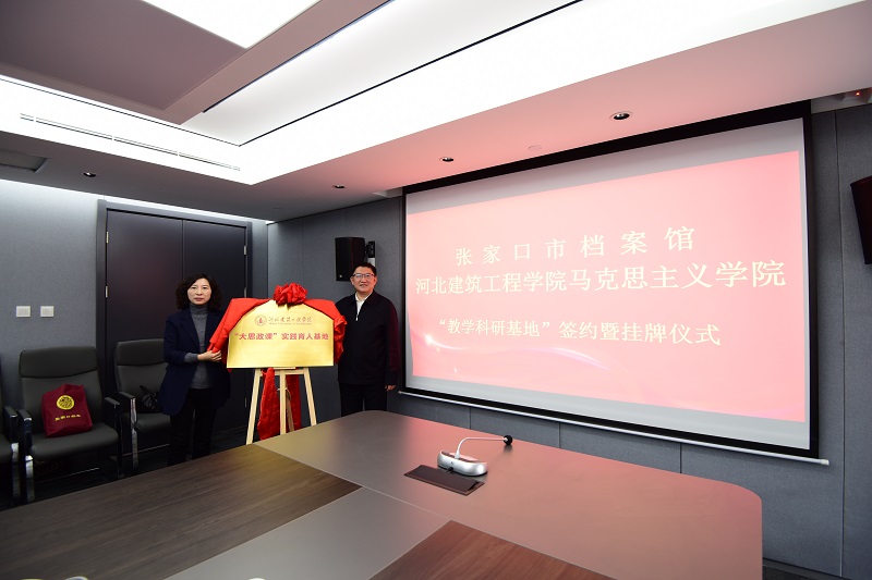 12月11日上午,我校與張家口市檔案館簽約共建教學科研基地。校黨委書記師涌江、教務處處長梁建明、科研產業處處長賈玉貴、馬克思主義學院院長曹宇、市檔案館館長馬麗芳、三級調研員康文清、副館長周瑾、副館長李帥帥、黨總支專職副書記陳鵬宇、地方志和編研部部長陳文靜,及我校教師代表出席座談會和簽約儀式。曹宇與周瑾簽訂共建協議。師涌江與馬麗芳為基地揭牌。
