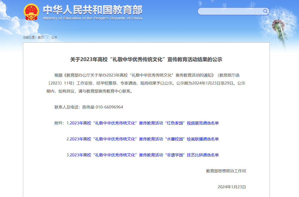 近日,教育部公示2023年高校“禮敬中華優秀傳統文化”宣傳教育活動結果,我校報送的作品《古韻宮燈,滿載民心辟新航》入選“非遺學園”技藝比拼遴選名單。
