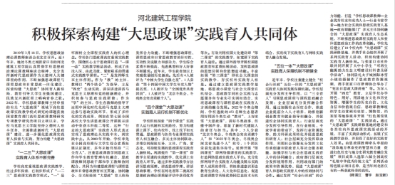 2019年3月18日,習近平總書記主持召開學校思想政治理論課教師座談會并發表重要講話。這一標志性會議成為了新時代思政課建設發展的重要航向標。五年來,我校認真貫徹“3.18”講話精神,充分發揮新時代思政課作為立德樹人關鍵課程的作用,不斷加強思政課程與課程思政和日常思政一體化建設,探索構建“大思政”協同育人新格局,教育引導大學生在強國建設、民族復興的生動實踐中唱響青春之歌。2022年學校思政課教師主持申報的有關“大思政課”視域下高校思政課實踐教學模式研究的課題獲批教育部高校思政課教師研究專項教學研究類項目立項以來,學校馬克思主義學院堅持立德樹人根本任務,全面推進新時代“大思政課”建設,進一步強化思政課實踐育人探索與實踐,努力構建“大思政課”實踐育人共同體。近日,《中國教育報》報道了我校師涌江、曹宇、趙寶新撰寫的“積極探索構建‘大思政課’實踐育人共同體”成果文章。