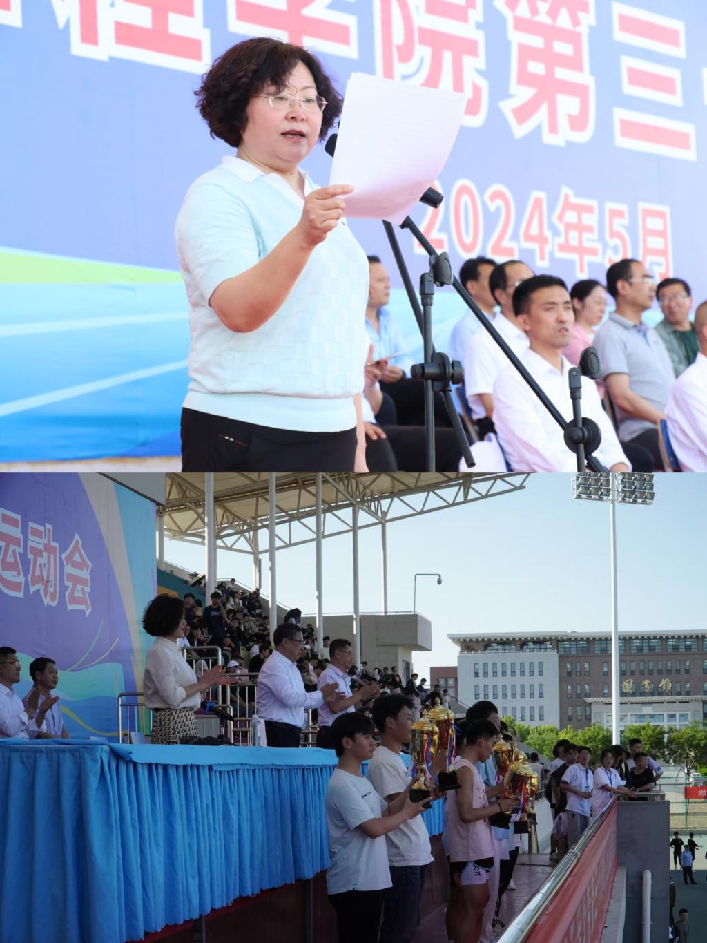 本屆運(yùn)動(dòng)會(huì)總裁判長(zhǎng)閆磊磊宣布比賽成績(jī)和各項(xiàng)體育賽事獲獎(jiǎng)集體名單。榮獲本屆運(yùn)動(dòng)會(huì)“團(tuán)體總分”前三名的分別是土木工程學(xué)院、經(jīng)濟(jì)管理學(xué)院、信息工程學(xué)院。與會(huì)領(lǐng)導(dǎo)為獲獎(jiǎng)單位和集體頒獎(jiǎng)。