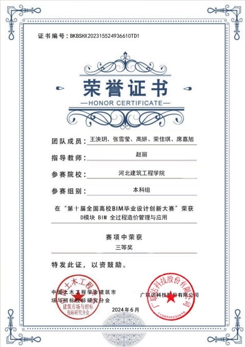 近日,第十屆全國高校BIM畢業設計創新應用大賽落下帷幕,我校經濟管理學院工程管理、工程造價專業四支隊伍歷經全國高校海選賽、全國總決賽,突出重圍,最終由崔域楷、賈樂天、任春宇、高若璠、劉雪原組成的瑾諾團隊榮獲“E模塊 BIM建設工程項目管理應用” 一等獎一項;由李曉帥、劉圣群、曹雨軒、楊丹組成的挑戰者聯盟團隊榮獲“A模塊 施工BIM建模與應用”二等獎一項;由楊金琦、李子陽、郝東勛、齊澤陽組成的開拓者666團隊榮獲“D模塊 BIM全過程造價管理與應用”二等獎一項;由王泱玥、高妍、榮佳琪、席嘉旭、張雪瑩組成的福祿壽喜財團隊榮獲“D模塊 BIM全過程造價管理與應用”三等獎一項。徐玲玲、時穎、鐘麗華、王赫、張立娟、吳玉婷、趙麗7位老師被大賽組委會授予優秀指導教師榮譽稱號。