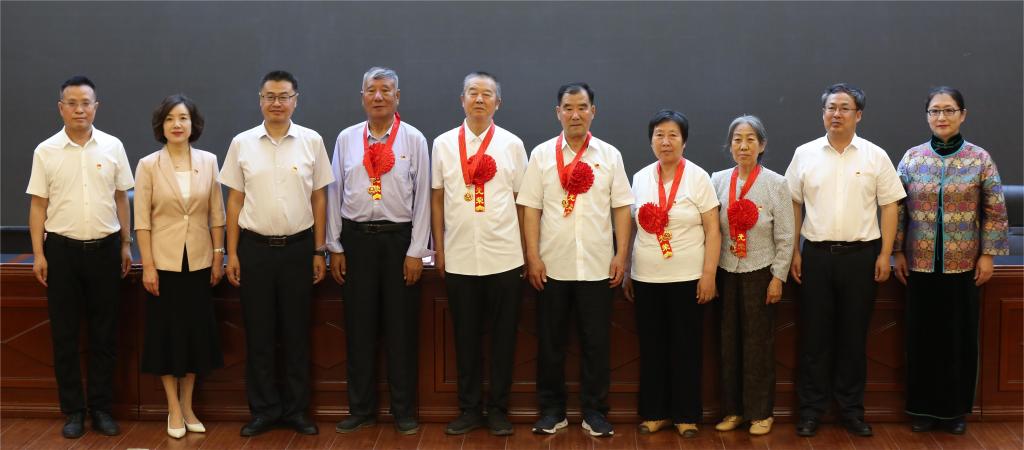 校領導為學校“兩優一先”獲獎黨員代表頒發榮譽證書和獎牌。