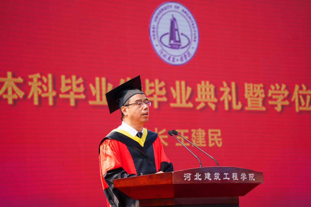 典禮在莊嚴的國歌聲中拉開帷幕。校長王建民代表學校向順利完成學業的畢業生表示誠摯的祝賀,他寄語畢業生們要心中有光,做堅守理想的追夢人;要擁抱變革,做勇于創新的弄潮兒;要心懷熱愛,做腳踏實地的建設者。