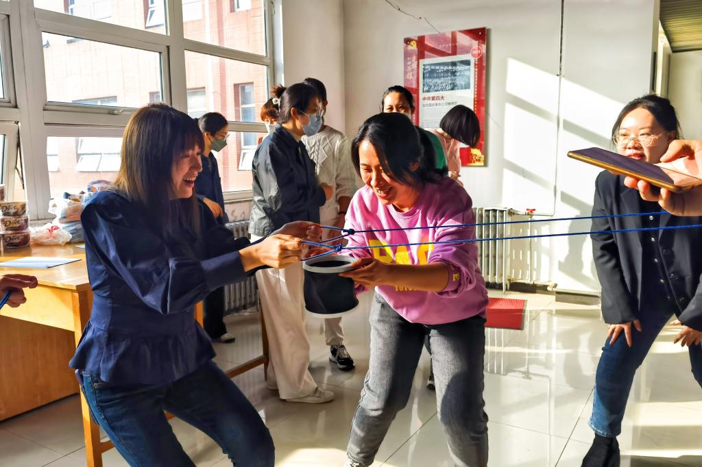 女教師們積極參與到活動中,陽光熱情,展現女性魅力,歡慶佳節。三人一組的“夾彩色球競賽”,比賽一開始,參賽女教師們就用她們健康、樂觀的精神面貌和輕盈、歡快的身形帶動著場上的氣氛,活動現場頓時變成了歡樂的海洋,加油助威聲、開心的笑聲此起彼伏。在“投壺競賽”活動中,女教師們本著友誼第一、比賽第二的精神,比賽中表現得相當積極,現場滿是輕松和歡快的氛圍。在“縱橫天下競賽”項目中,老師們起初難以把控傳球角度和傳球速度,來來回回多次失誤,但是經過一段時間的磨合之后,參加的教師們的配合慢慢變得默契起來,最終每組教師的成績都在一分鐘之內,最快的小組僅僅在24秒就完成了比賽,贏得了最終的勝利。