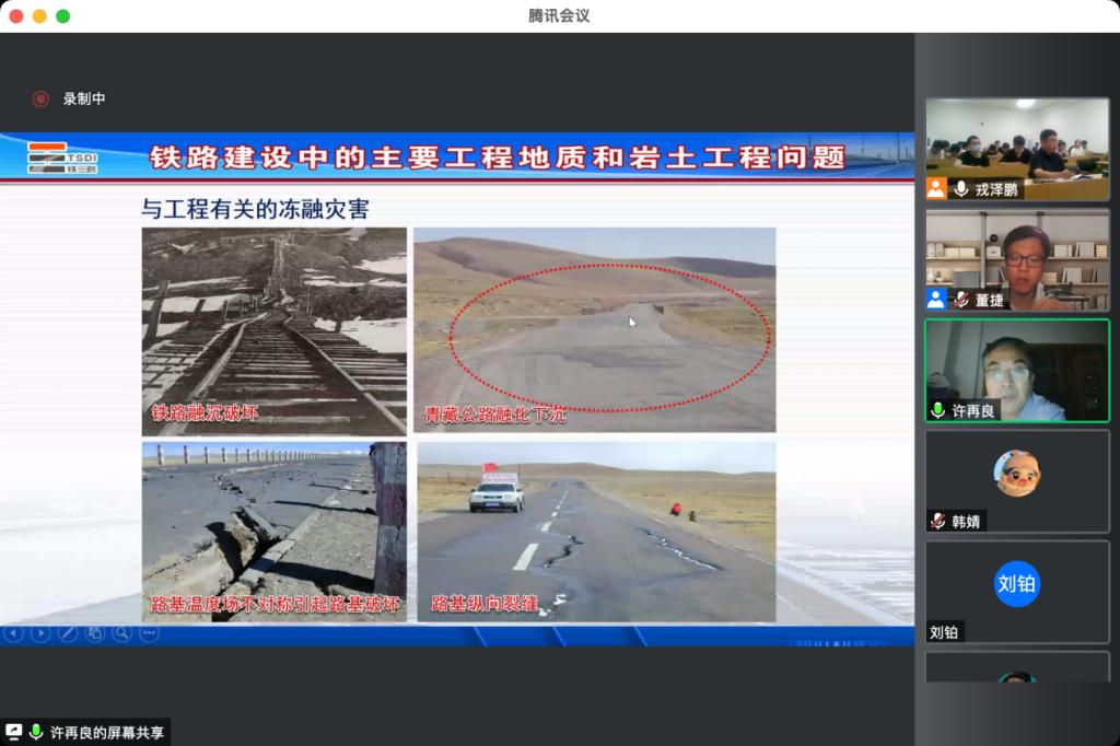 5月29日晚,土木工程學院邀請到中國鐵路設計集團有限公司全國工程勘查設計大師許再良為我院師生作《高速鐵路與工程地質》的線上學術報告。本次學術交流活動由副院長董捷(主持工作)主持,活動采用線上線下相結合的方式。參加此次學術報告的師生包括勘查技術與工程專業本科生、學校研究生以及相關專業教師,合計人數達300余人。