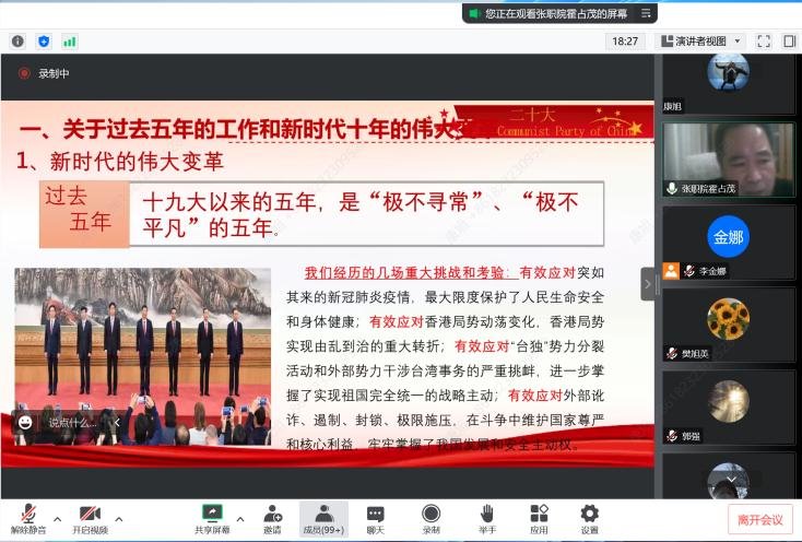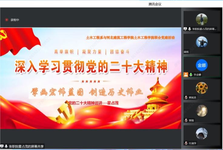 12月22日晚,土木工程學院聯合張家口職業技術學院土木工程系組織題為《擘畫擘畫宏偉藍圖 創造歷史偉業》黨的二十大精神線上宣講活動,宣講會特別邀請到張職院馬克思主義學院形勢與政策教研室主任霍占茂教授做專題報告。土木工程學院全體教師和學生黨員以及張家口職業技術學院部分師生參加了宣講會。