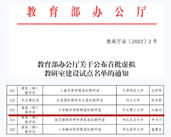 近期,教育部辦公廳公布全國首批虛擬教研室建設試點名單,確定首批虛擬教研室建設試點439個,大學數學課程群全國共4個,華北理工大學劉春鳳教授牽頭申報的“大學數學課程群虛擬教研室”獲批。我校數理系數學教研室有幸參與建設,與全國同行專家相聚云端,助力大學數學的建設,助力高校人才的培養。