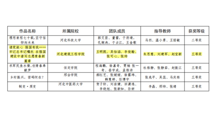 10月31日,“新思想引領新征程· 新青年建功新時代”——第七屆河北省高校大學生講思政課公開課展示活動(本科組)獲獎名單公布,我校師生作品《請黨放心 強國有我——牢記總書記囑托 在強國建設中譜寫志愿青春新篇章》斬獲省賽三等獎,并被推薦參加國賽。
