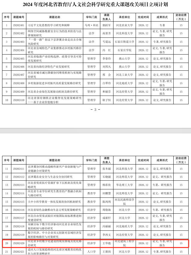 把科研做在美麗鄉村。馬克思主義學院王華彪教授團隊長期深耕“三農”專題研究,獲批河北省科協“河北省數字鄉村研究基地”,今年1月,獲批省教育廳人文社會科學研究重大課題“河北省鄉村數字化建設的現實困境及優化路徑研究”(ZD202420)并順利開題。3月,基地受張家口市委宣傳部委托,主持并參與了中宣部文明辦在張家口市組織的農村精神文明及鄉賢建設情況的調研報告。4月25日,該基地多篇論文參與重慶市社科界第八屆鄉村振興學術年會并獲獎,其中《推進新鄉賢回歸助力鄉村振興的實踐向路》《做實“引育用管留”五篇文章 構筑人才集聚新高地》分獲論文一、三等獎,基地主要成員白明宇參加論壇并做主旨發言。