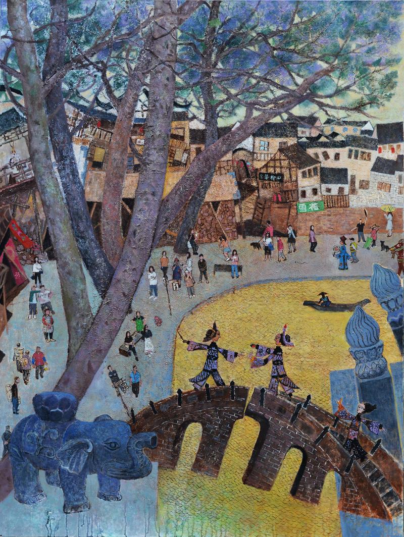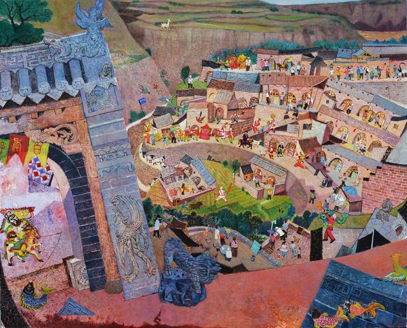 同時把現代繪畫語言的平面性、裝飾性等特征與自然風景和傳統文化相結合,表現質樸、純凈、喜慶的新鄉村題材。畫面靈活運用視點的變化,將既熟悉又夢幻的村莊、人物、云朵、樹木……都靈活、自由地展現于畫面,表達出田園牧歌的主題思想。