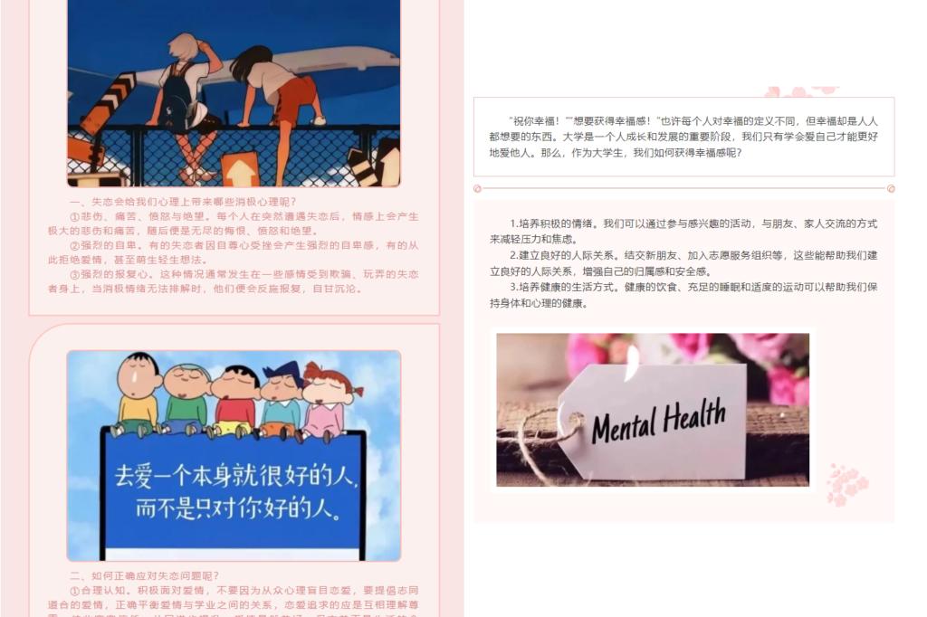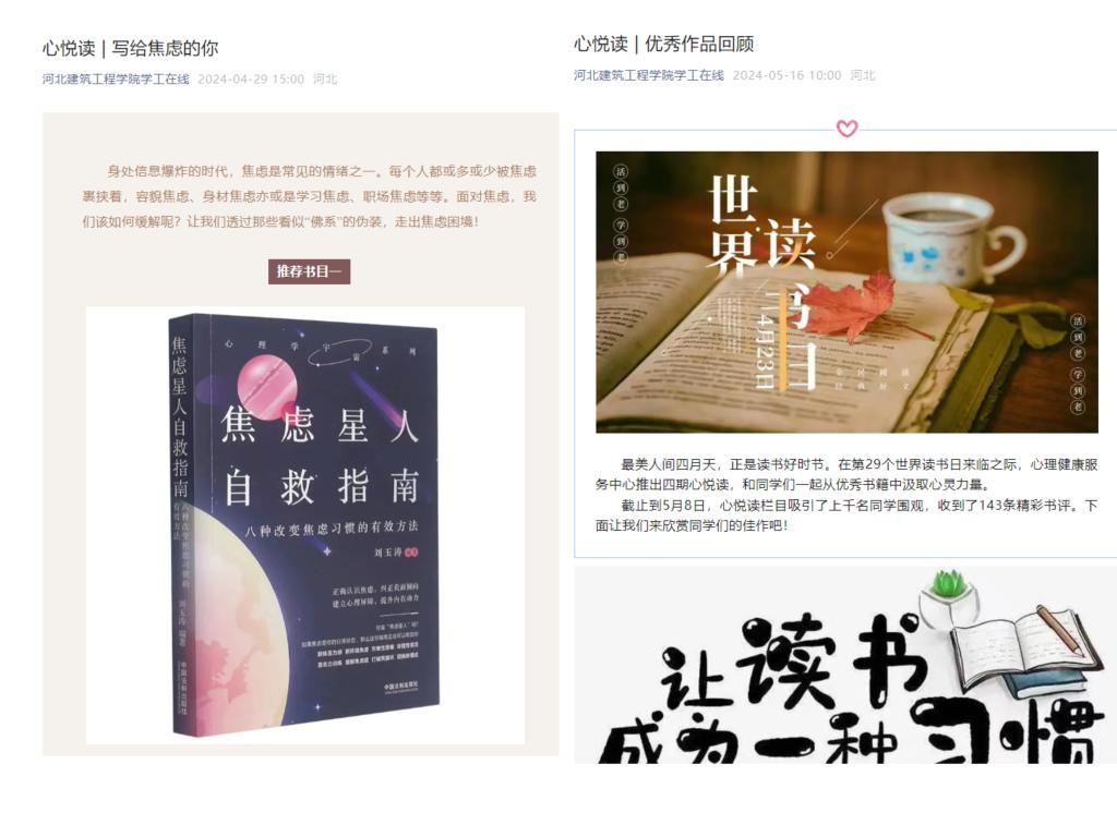 學生處心理健康服務中心征集學生心理健康大講堂精品課程、心理健康工作優秀案例、學生優秀心理健康作品等。舉辦“心語講堂”6期,內容涉及情緒管理、人際交往、戀愛心理、異常心理等方面;開設“心悅讀”4期,收獲千人圍觀、百人評論,評選出優秀書評四十余條;發布“心知識”多期,利用重要時間節點科普心理健康知識。各院系充分整合校內校外資源,運用公眾號、短視頻等新媒體手段,為師生和家長廣泛普及心理健康知識,如“以心相聚,關愛心理健康”系列心理健康小講堂。