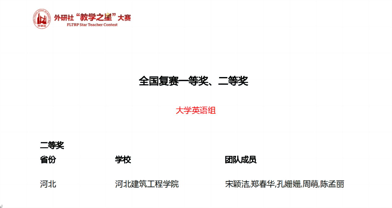 6月20日,2024年外研社“教學之星”大賽全國復賽獲獎名單揭曉,外語系再獲捷報,由宋穎潔、鄭春華、孔姍姍、周萌、陳孟麗五位老師組成的公共外語教學團隊榮獲“大學英語組”全國復賽二等獎。