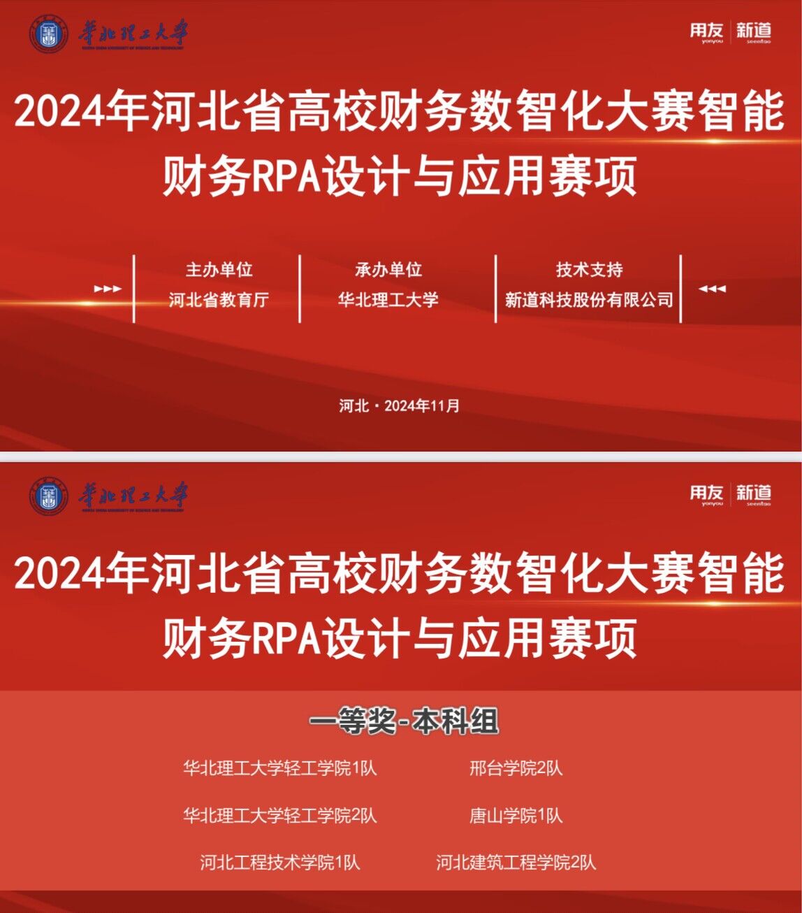 11月8日,由河北省教育廳主辦的2024年第四屆河北省高校財務數智化大賽——智能財務RPA設計與應用賽項落幕,共有全省本科組56支代表隊參賽,經過激烈角逐,由我校教師劉雅軍、劉曉東帶領的隊伍榮獲河北省一等獎,創造了學院在此項比賽中的最好成績。