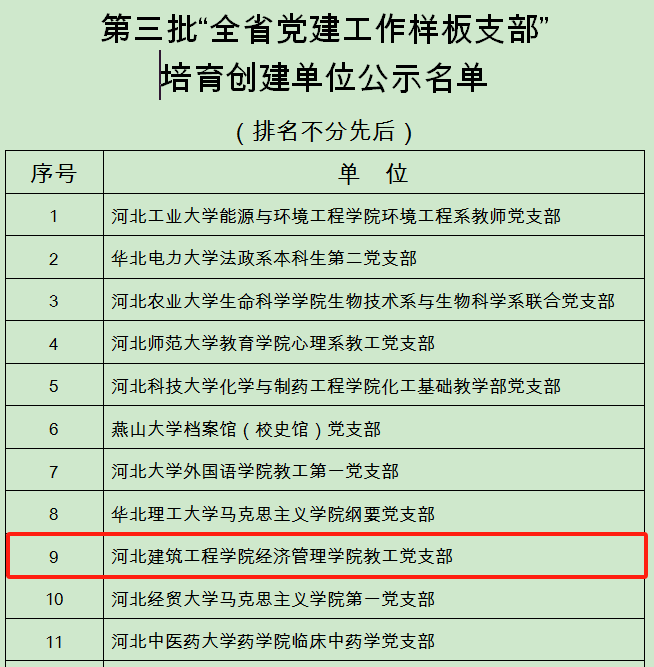 近日,中共河北省委教育工作委員會(huì)公布了全省第三批新時(shí)代高校黨建示范創(chuàng)建和質(zhì)量創(chuàng)優(yōu)遴選結(jié)果。我校經(jīng)濟(jì)管理學(xué)院教工黨支部入選“全省黨建工作樣板支部”培育建設(shè)單位。